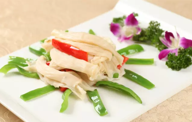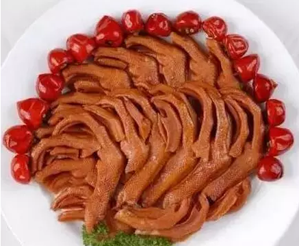 龙须凤爪是非常考究的一道菜,“龙须”是活鲤鱼的鱼须,“凤爪”是活鸡掌下正中的一块精肉。要吃这道菜,后堂院中必然有一群瘸脚的鸡,池中必然有一群食不知味的鲤鱼,可怜芸芸众生。 4、烤鸭掌