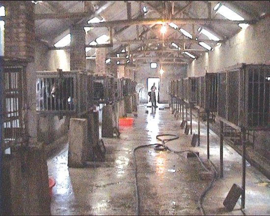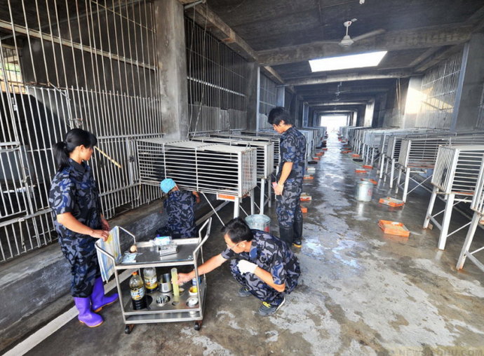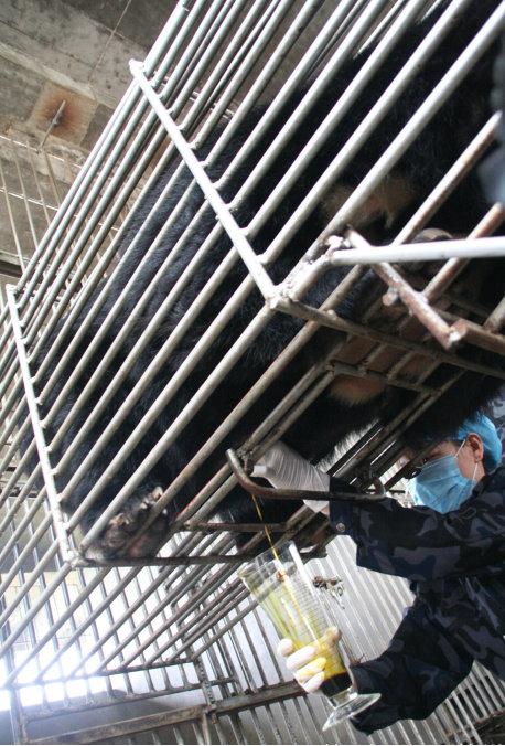 天亮后,带班的老张说领我去熊房看看。来到一个有几千平方米的高大建筑里,里面很空旷,平放着六个笼子,每个笼子里都有一只萎靡的黑熊。奇怪的是它们身上都箍着一个明晃晃的像兜肚的东西。老张告诉我,“这是取胆汁用的,现在的熊胆汁价格是每克300元。”他带我来到第一个笼子跟前,打手势告诉我:“采胆汁开始了。”我看见两个彪悍的工人麻利地左右绑好熊躯,在那钢兜肚两侧各拉起一条粗大的绳子,经过一个特制的滑轮,齐喊了声“嗨!”只见熊身上的钢兜肚渐渐地收缩着收缩着。突然,熊发出了歇斯底里的吼喊:“呜……!”那简直不是吼叫啊,那是变了形状的凄哭,之间它拼命仰着头痛苦地瞪圆了眼睛,四个粗大的掌子在有限的空间蹬抓着地面,发出“滋拉,滋拉”地刺耳声响,瞬间,那腹下的钢管里“滴答,滴答”地流出了碧绿色的液体。操作工人又慢慢松开绳子,接着拉起下一个回合,又是一个声嘶力竭的泣叫。我看到熊的眼泪瞬时淌下来,它竟然也像人一样咬紧了牙齿,躬起了身体去承受着无休止的痛苦。好悲惨的一幕啊,我不忍再看,扭头走开了。此时,我才明白,夜里那些悲叫是这些带着伤痛的熊,在难挨的暮色里发出的呻吟啊。老张跟我到门口,我声音颤抖的质问他:“你们还有人性吗?它们可都是生命啊!”老张淡淡地说道:“没办法,我们干的就是这样的活啊。”情绪稍定,我无奈地问他:“多长时间采一次胆汁?”他回答道:“那要看情况了,胆汁多的一天两次,少的最迟两天要一次,一般一个熊年产胆粉2000克,可以采10年。”我的心战栗了,一天两次,10年,这是个什么样的魔鬼数字啊,也就是说,这样欲死的折磨每天都要进行两次,要在这样欲生不能的刑法里忍受10年,7200次剜心剔骨啊。要日复一日,年复一年的熬啊,纵是人的坚强生命力,也肯定难以坚持下来,我的心痛痛的。