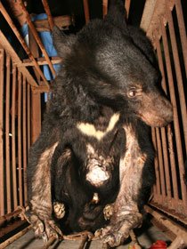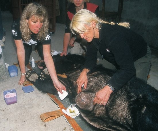 (抢救月亮熊,左边为谢罗便臣女士。右边是郭慧玲医术总监(扎辫子) 有的熊无法忍受每日取胆的痛苦,曾掏肚肠自杀。为了防止它们自戕,就特制了这种铁马甲,日夜穿在它们身上,由于抽胆的伤口从来不闭合,从来没痊愈;由于长年累月地受尽折磨,很多熊都患上肿瘤,得了癌症,这个熊得的就是肝癌。穿着铁马甲被抽胆的熊,铁马甲都腐烂了,不知道已经抽了多少年。