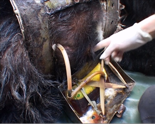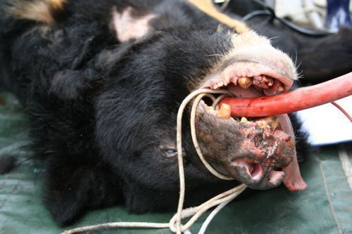 穿着铁马甲被抽胆的熊,铁马甲都腐烂了,不知道已经抽了多少年 。