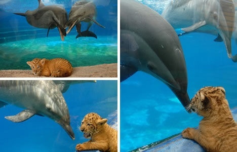 图中趴在玻璃边的小家伙是只仅有6周大的狮虎(liger)。它的爸爸是狮子,妈妈是老虎。据了解,狮虎是世界上最大的猫科动物,能长到12英尺长。然而,图中的这只幼狮虎却着实惹人怜爱。在深圳野生动物园(shenzhen safari park),我们可以看到这样的景象:小狮虎和三只海豚隔着玻璃行碰鼻礼,它们是最好的朋友。鳍片和皮毛,水里和陆地,看似永远不会相关的两种动物,在此萌生了美好的友谊,没有时间、空间及种族的距离,这份友谊暖人心房。