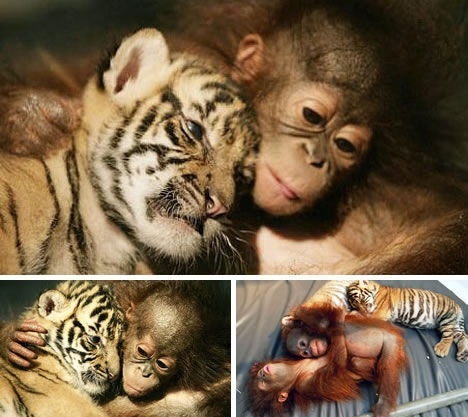 图中5个月大的猩猩和濒临灭绝的苏门答腊幼虎(sumatran tiger )都被他们的母亲抛弃了。印度尼西亚动物医院把这两个小家伙放到了一块。或许是因为同命相怜,它们成了好朋友。图中他们惺惺相惜的表情,让人很心疼,却又会萌生出一种感动。