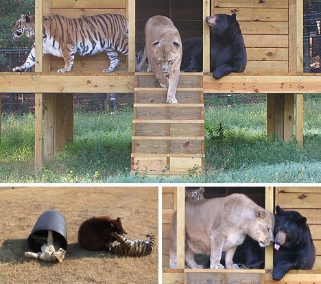一只老虎、一只狮子和一只熊的组合不能不为之震惊。据悉,“三剑客”仅两个月大的时候就生活在了一起。他们是在一次毒品突袭行动中获救。当时主人把它们当做身份的象征。后来三个家伙一并住进了位于乔治亚州(georgia)的诺亚方舟动物救助中心(noah’s ark animal rescue center )。八年后,这三只动物深信彼此就是自己的兄弟,其中的熊现在已有1000磅中,老虎希瑞•坎(shere khan)重350磅,狮子里奥(leo)也重350磅。生活只是一种习惯,习惯了就是永恒。