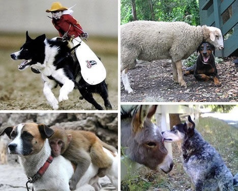 狗往往被称为人类最好的朋友。然而人类不是狗唯一的朋友。18岁的卷尾(capuchin monkey)猴煞是威风地骑在一只牧羊犬的背上。还有让我们惊讶不已,当事人却不觉得奇怪的“羊狗之恋”。一只小猴赢得了最忠诚的守护者,它可以安然地躺在狗狗的背上,笑看世界冷暖。还有一只狗深情地在一只驴的额头上留下了它的吻,不知道它们是否暗暗传递了类似“我爱你”的信息。上述种种的主角们似乎在说:吾等在乎友谊存亡,不在乎世人眼光。