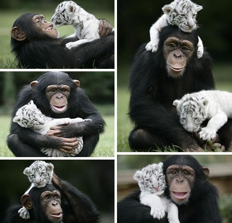 正如你看到的,这是一只黑猩猩和两只小白虎。若问它们如此亲密无间的理由?黑猩猩安贾娜(anjana)可是小白虎米特拉(mitra)和施瓦(shiva)的乳母。对于任何动物来说,双胞胎是件很棘手的事,而这两个小家伙的亲生母亲因受台风影响而极富攻击性,不能抚养两个脆弱的生命。于是两岁大的黑猩猩安贾娜和查娜(china)成了小家伙的乳母。猩猩妈妈给了两个小家伙最真切的爱,经常陪它们玩耍,并且喂给它们食物。原来,母爱可以跨越种族,可以跨越“肤色”。