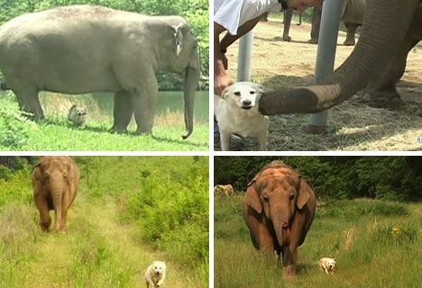 重8700镑的亚洲象塔拉(tara)从马戏团退休后就被送往美国田纳西州(tennessee)的大象保护区。在那里,它遇到了小狗贝拉(bella),它们成了亲密无间的好朋友。这一大一小的组合看起来有点奇怪,但是它们的友情深厚到恐怕连人类都自愧不如。那时,贝拉脊髓受伤,腿和尾巴都不能动了,住进了保护区办公室。塔拉就守在办公室大门边上,足足守候了3周时间。后来贝拉伤情好转,被抬出了办公室,这对老友得以重聚了。塔拉陪着贝拉,直到贝拉可以行走。很多时候,执着地相守,是件简单却又艰难的事。