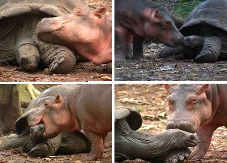 一场海啸之后,这个重650磅的小河马欧文(owen)得以幸存。彼时,它的身体下面是一只130岁海龟恩泽(mzee)。在肯尼亚蒙巴萨岛(mombasa)的哈勒野生动物保护区(haller park wildlife sanctuary ),欧文总是紧跟着恩泽,自然而然,这一老一少也成了亲密无间的好朋友。随着欧文逐渐长大,它们仍旧睡玩在一起。图片中我们不难看出它们之间的感情非同一般,它们甚至还创造了属于它俩的语言。它们时而紧紧相偎,时而窃窃私语,这难道不正是好朋友之间会做的吗?一句话说它们最合适不过,忘年之交,交万年。