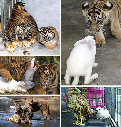 不知是什么原因,许多的狗都曾把幼虎当做它们自己的幼崽。据悉,在赣江(kan)的野生动物园,有只黄色叫伊莎贝拉的母狗就收养了三只幼虎。无独有偶,在中国济南市跑马岭野生动物园(paomaling wild animal world)三只新生的三胞胎幼虎被一只农场狗花妮收养。花妮曾经也做过幼虎的乳母。除此以外,在日本,一只法国斗牛犬变成了一只2周大的孟加拉国虎的至交。还有一只在中国长春动物园的狗担当起了两只幼虎的乳母,而且显而易见的是,这两只幼虎和她并不相象。在波兰华沙动物园(warsaw zoo),3个月大的幼虎卓娅(zoya)被母亲排斥,却与同龄的阿尔萨斯小狗(alsatian puppy )做起了朋友。有时候,友谊是上帝开的一扇窗。